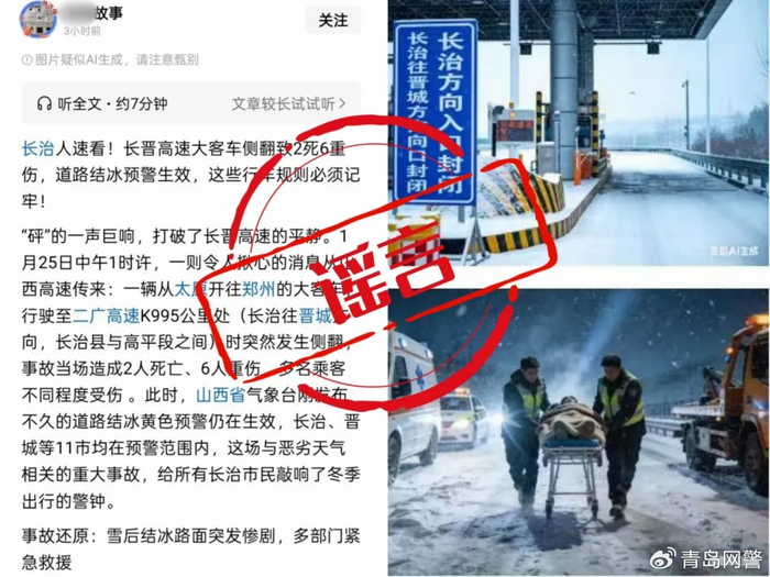 经公安机关调查,帖文中提及的路段并未发生交通事故,所谓“事故造成2人死亡、6人重伤,多名乘客受伤”等内容,均属虚假信息。发帖人赵某为博取关注、赚取流量收益,利用AI软件生成图片,并编造不实信息,通过其个人自媒体账号进行散布。