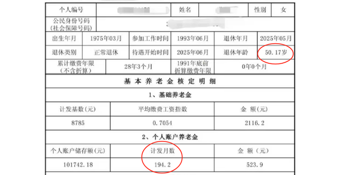 比如前面这位退休年龄是50.17岁,他的计发月数就变成了194.2了,有零有整。