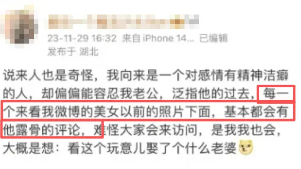 妻子生前曾发微博说,丈夫平时会给各种美女留言露骨评论,风流成性。