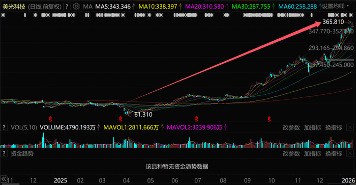 美股的美光科技,股价从2025年4月的60美元附近,一路涨到目前的365美元,股价暴涨近500%。