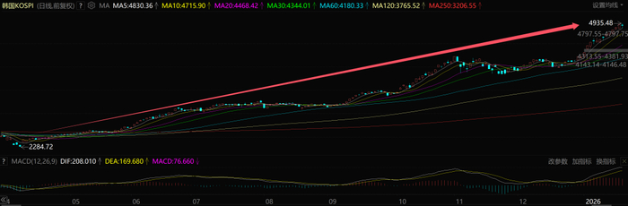 在韩国综合股价指数(KOSPI)中,三星电子占指数权重约18.33%,是最大单一权重股;SK海力士权重约10.89%,是第二大权重股。两家巨头在KOSPI指数中的权重合计约为30%,得益于两者股价暴涨,韩国股市从2025年4月的2284点,暴涨到最近的4935点,涨幅高达116%。