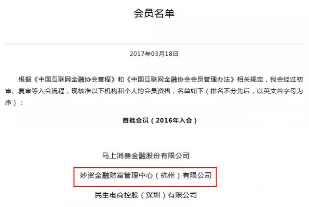 不仅用户多,根据公开信息“妙资金融”还是今年我国3月成立的“中国互联网金融协会”(以下简称“互金协会”)的首批408家会员之一,对了,他们那时候还宣称自己是“协会发起单位之一”: