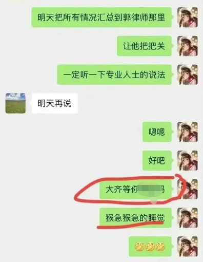 并且两人的对话之间能看出来明显是“郎有情妾有意”,“取保候审”、“律师”、“税务”等词出现在聊天中,很难不让人觉得女方似乎为自己在职场上谋好处。