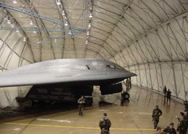 图为B2轰炸机停放在专属空调机库中最后,B2轰炸机为了保障优异的隐身性能做了许多设计,例如降低飞行噪音、机身红外线辐射、减小视觉辨识度和降低雷达波特征等多个方面。因为这些设计,B2轰炸机大大减少了自身对空中掩护、电子对抗等支援飞机的依赖。但它的隐身能力也并非万能,在小于40公里的距离内和一定光线的特定条件下,B2轰炸也容易被目视发现和拦截。并且由于它所使用的隐身涂层异常娇贵,B2轰炸机在地面必须停放在价值500万美元的专用空调机库,以保持其隐身涂层的可用状态。在B2轰炸机服役期间,每隔7年,就需要地勤人员去清除掉B2轰炸机除机身外部分的隐身涂层来检查机体表面是否有所损坏,任何凹凸或刮痕都会影响隐身涂层的附着和整体隐身特性的发挥。因此,B2轰炸机为了保持其隐身特性,需要耗费大量的金钱及人力,成本也进一步上升。