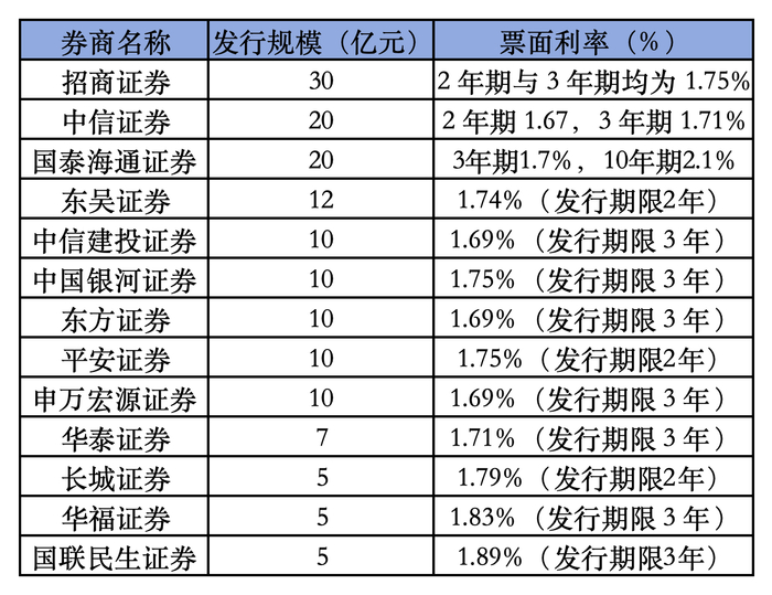 受期限不同等因素综合影响,首批券商科创债的发行票面利率区间在1.67%至2.1%。其中,中信证券2年期品种1.67%为最低,国泰海通10年期品种2.1%为最高,其余11家券商的发行票面利率区间集中在1.69%至1.89%。