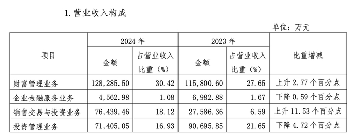 细分业务上,财富管理业务依然是国海证券2024年主要收入来源,全年实现收入12.83亿元,营收占比为30.42%,同比增长11%;销售交易和投资业务迎来同比大增177%至7.64亿元,贡献了18.12%的营收。