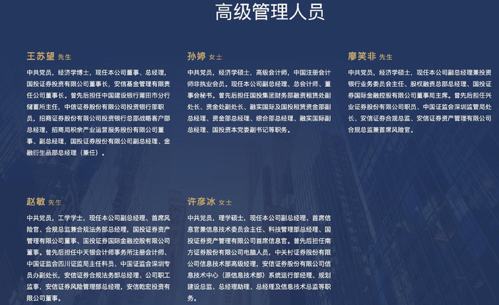 图片来源:国投证券官网目前,国投证券财务总监职务空缺已超半年。此外,由于公司没有分管业务的副总,多项事务均由总经理王苏望统筹,肩上担子不轻。