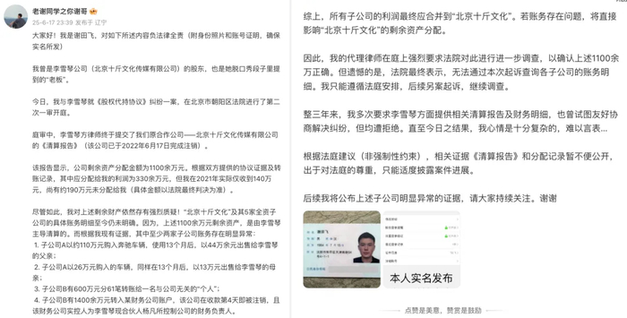 谢田飞对上述剩余财产分配仍存强烈质疑。其指出,“北京十斤文化”及其5家全资子公司的具体账务明细至今未明确。由于上述1100余万元剩余资产由李雪琴主导清算,而根据其现有证据,至少两家子公司账务存在明显异常。