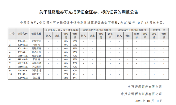 记者注意到,10月10日收市后,申万宏源公告调整了融资融券可充抵保证金证券及折算率,自10月13日起生效。其中,先导智能、南极光、曼恩斯特、联动科技、海光信息、长盈通、佰维存储、中芯国际、华信永道等个股的可充抵保证金证券折算率由0上调至30%-70%不等。通裕重工、创益通两股的折算率则由65%下调至0%。