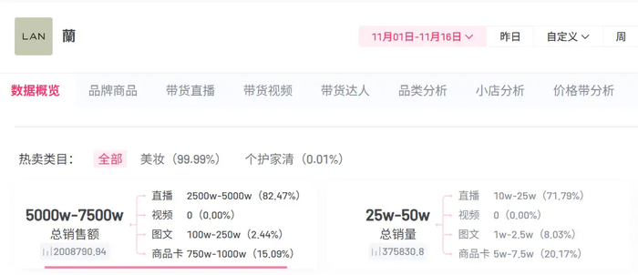 据36氪报道,2020年,品牌创始人丁小兰表示,“LAN兰”当年实现2亿元营收。近两年随着“以油养肤”概念兴起,“LAN兰”销售额持续增长。蓝鲸新闻记者通过第三方数据平台查询发现,11月以来“LAN兰”仅抖音平台总销售额为5000万-7500万元间。不过“以油养肤”赛道火热的同时竞争激烈,除“LAN兰”之外,包括林清轩、PMPM、双妹等品牌主打品均为精华油,其中林清轩已正式向港交所递交招股书,冲刺高端国货护肤第一股,双妹则背靠上海家化,近些年在宣发上频频发力,“LAN兰”想要突出重围并不容易。