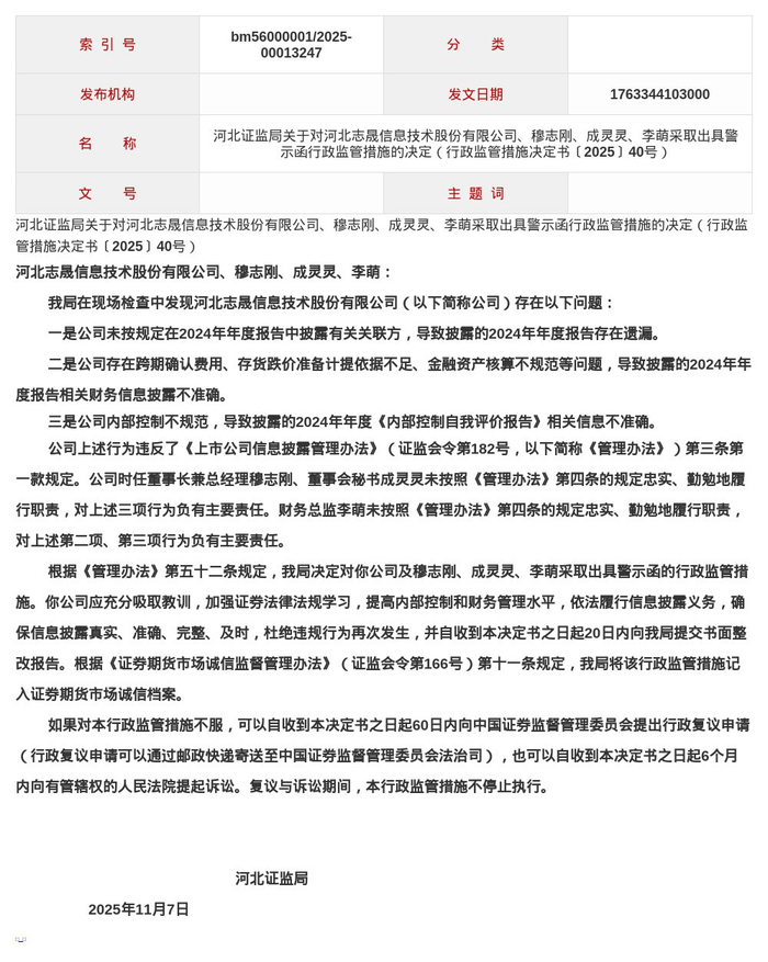 决定书指出,河北志晟信息技术在2024年年度报告中存在以下问题: