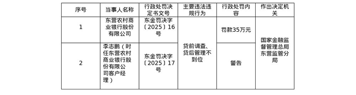 罚单显示,东营农村商业银行股份有限公司的主要违法违规事实(案由)为:贷前调查、贷后管理不到位。