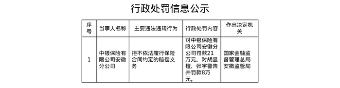罚单显示,中银保险有限公司安徽分公司的主要违法违规行为是:拒不依法履行保险合同约定的赔偿义务。