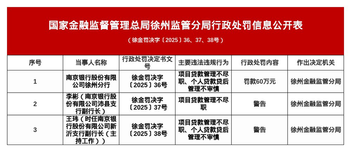 针对上述违法违规行为,国家金融监督管理总局徐州监管分局对其罚款60万元;对南京银行股份有限公司沛县支行副行长李彬警告;对南京银行股份有限公司新沂支行副行长(主持工作)王玮警告。