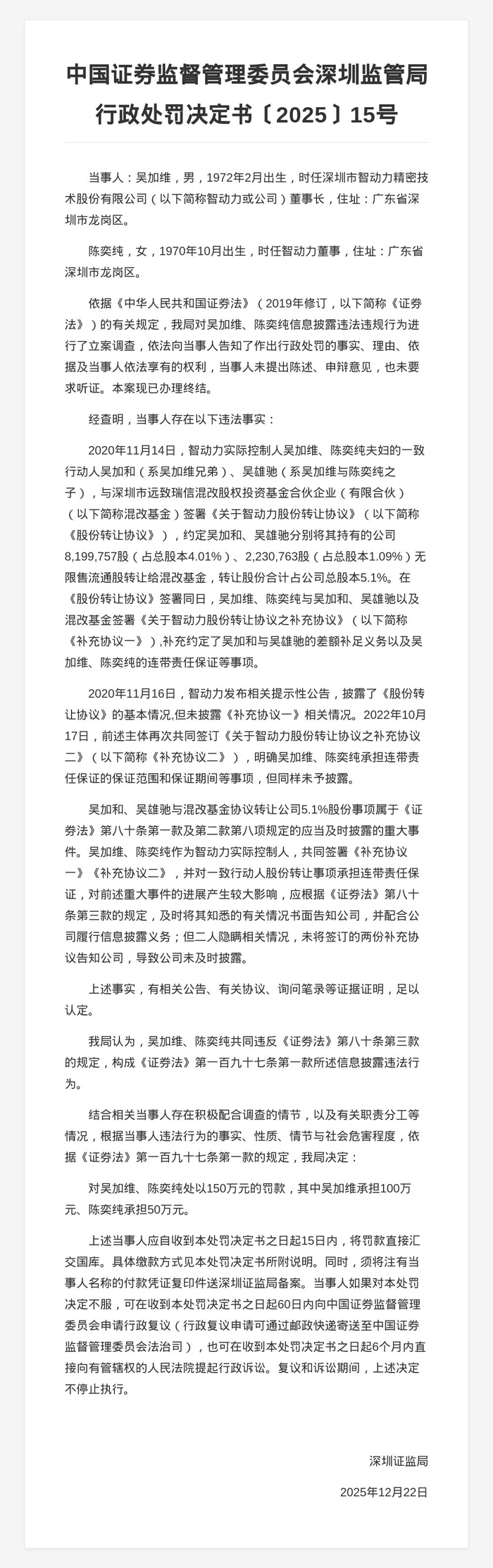 决定书显示,2020年11月14日,智动力实际控制人吴加维、陈奕纯夫妇的一致行动人吴加和(系吴加维兄弟)、吴雄驰(系吴加维与陈奕纯之子),与深圳市远致瑞信混改股权投资基金合伙企业(有限合伙)签署《关于智动力股份转让协议》,约定吴加和、吴雄驰分别将其持有的公司8,199,757股(占总股本4.01%)、2,230,763股(占总股本1.09%)无限售流通股转让给混改基金,转让股份合计占公司总股本5.1%。在《股份转让协议》签署同日,吴加维、陈奕纯与吴加和、吴雄驰以及混改基金签署《关于智动力股份转让协议之补充协议》(以下简称《补充协议一》),补充约定了吴加和与吴雄驰的差额补足义务以及吴加维、陈奕纯的连带责任保证等事项。