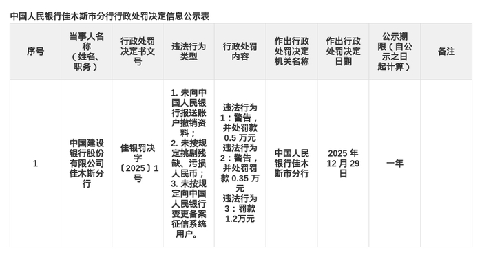 蓝鲸新闻12月29日讯,近日,中国人民银行佳木斯市分行发布了一张罚单,剑指中国建设银行股份有限公司佳木斯分行。