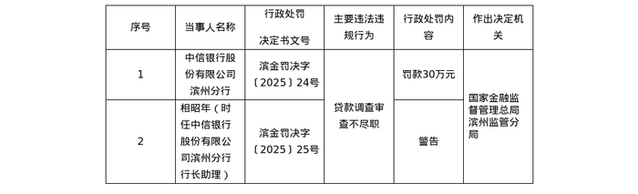 针对这一行为,国家金融监督管理总局滨州监管分局对其处以30万元罚款;对中信银行股份有限公司滨州分行行长助理相昭年警告。