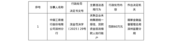 罚单显示,中国工商银行滨州分行的主要违法违规事实包括:关联企业未纳入集团统一授信,以及贷款资金回流借款人他行账户。