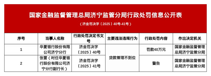 针对这一行为,国家金融监督管理总局济宁监管分局对其处以40万元罚款;对时任华夏银行股份有限公司济宁分行副行长的张雷,给予警告处罚。
