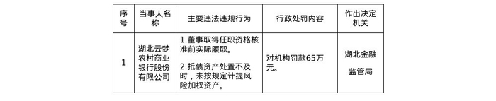 罚单显示,湖北云梦农村商业银行的主要违法违规事实包括:一是董事在取得任职资格核准前实际履职;二是抵债资产处置不及时,未按规定计提风险加权资产。