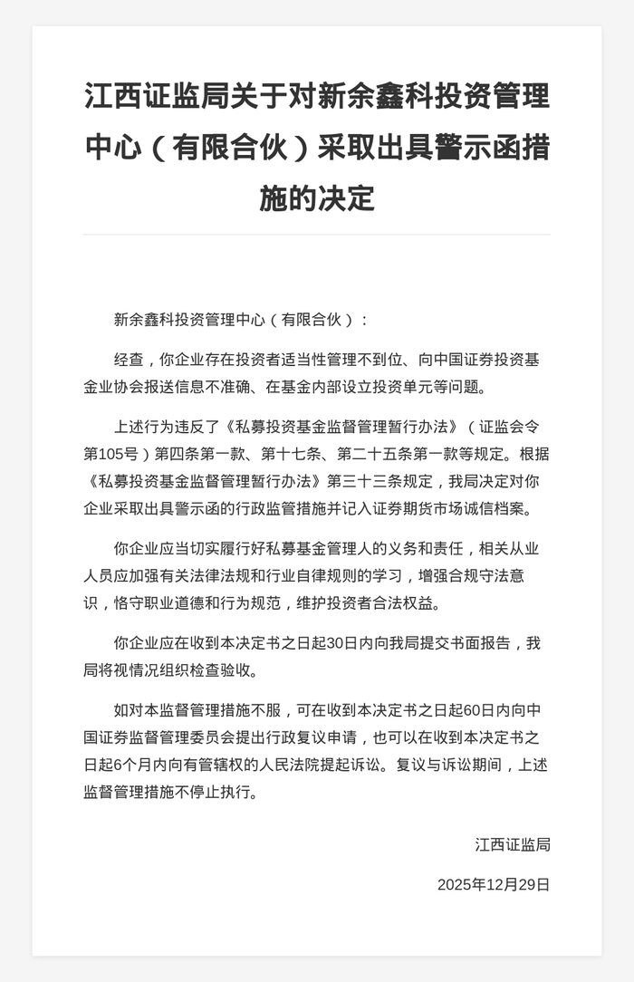 蓝鲸新闻1月5日讯,近日,江西证监局发布行政监管措施决定书,剑指新余鑫科投资管理中心(有限合伙)。