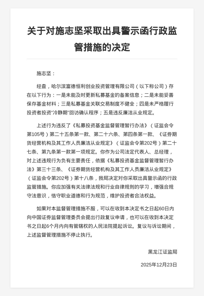 针对以上问题,黑龙江证监局决定对哈尔滨富德恒利创业投资管理有限公司采取责令改正行政监管措施;对施志坚采取出具警示函的行政监管措施。