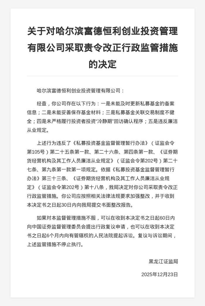 决定书显示,哈尔滨富德恒利创业投资管理有限公司存在以下行为:一是未能及时更新私募基金的备案信息;二是未能妥善保存基金材料;三是私募基金关联交易制度不健全;四是未严格履行投资者投资“冷静期”回访确认程序;五是违反廉洁从业规定。