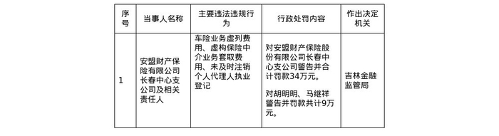 罚单显示,安盟财产保险股份有限公司长春中心支公司的主要违法违规事实包括:车险业务虚列费用、虚构保险中介业务套取费用、未及时注销个人代理人执业登记。