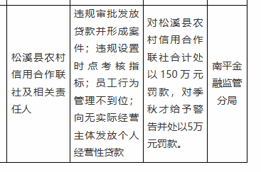 罚单显示,松溪县农村信用合作联社的主要违法违规事实(案由)为:违规审批发放贷款并形成案件;违规设置时点考核指标;员工行为管理不到位;向无实际经营主体发放个人经营性贷款。