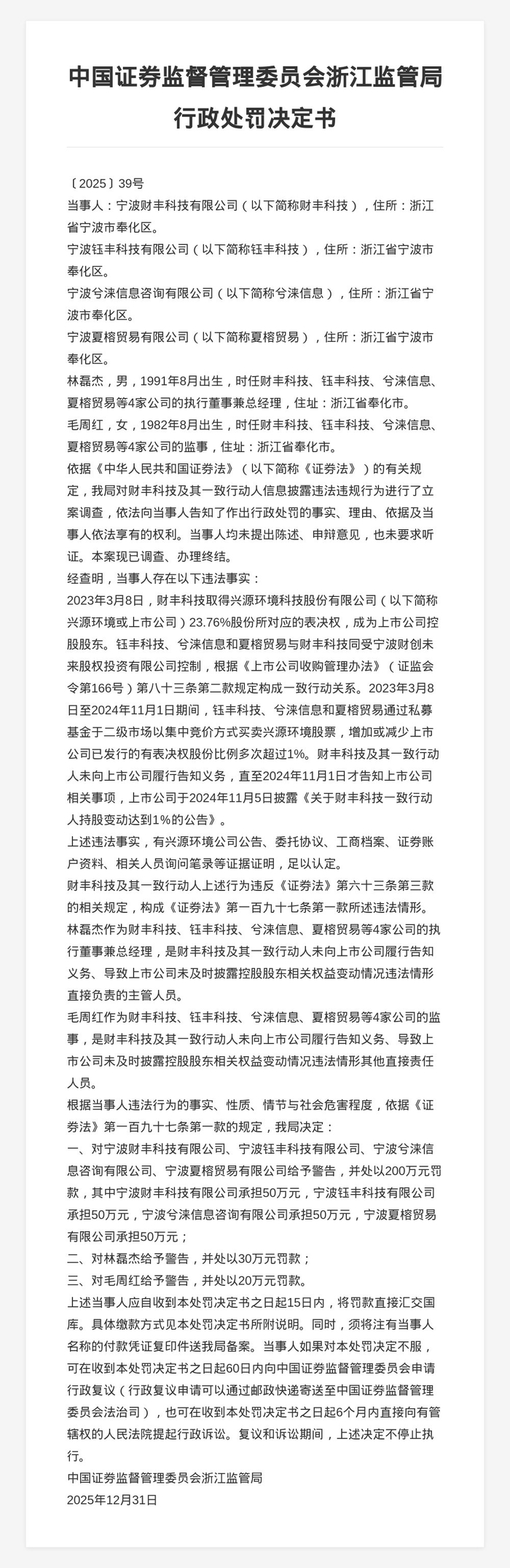 决定书显示,2023年3月8日,财丰科技取得兴源环境科技股份有限公司23.76%股份所对应的表决权,成为上市公司控股股东。钰丰科技、兮涞信息和夏榕贸易与财丰科技同受宁波财创未来股权投资有限公司控制,根据《上市公司收购管理办法》规定构成一致行动关系。