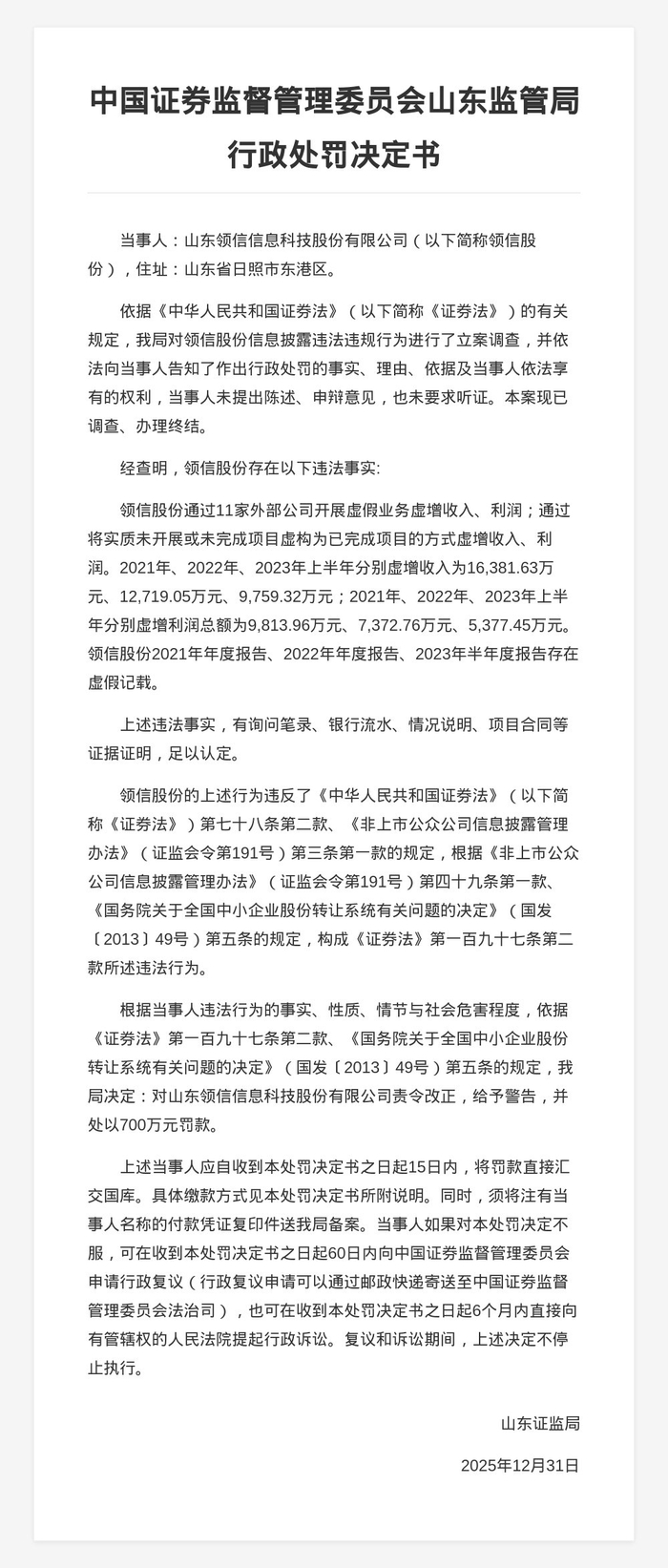 针对以上问题,山东证监局决定对山东领信信息科技股份有限公司责令改正,给予警告,并处以700万元罚款。