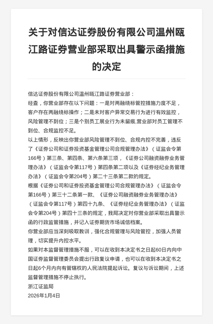 对此,浙江证监局决定对信达证券股份有限公司温州瓯江路证券营业部采取出具警示函的行政监管措施,并记入证券期货市场诚信档案。