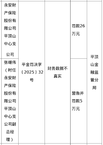罚单显示,永安财产保险股份有限公司平顶山中心支公司的违法违规事实为:财务数据不真实。