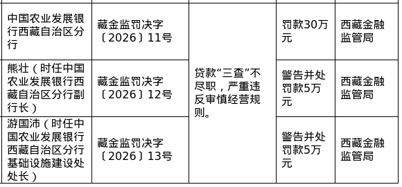 针对以上问题,西藏金融监管局对其罚款30万元;对时任副行长的熊壮和基础设施建设处处长的游国沛,分别警告并处罚款5万元。