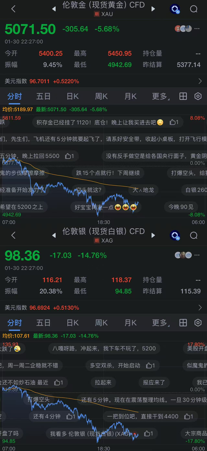 北京时间1月30日晚,现货黄金一度向下触及约4950美元/盎司,失守5000美元/盎司,日内跌超8%;现货白银一度跌至95美元/盎司附近,跌幅近18%,跌破100美元/盎司重要心理支撑位。