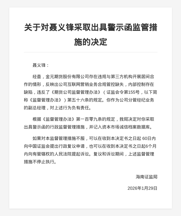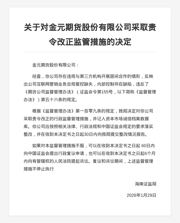 蓝鲸新闻2月1日讯,近日,海南证监局发布行政监管措施决定书,剑指金元期货股份有限公司及相关责任人。