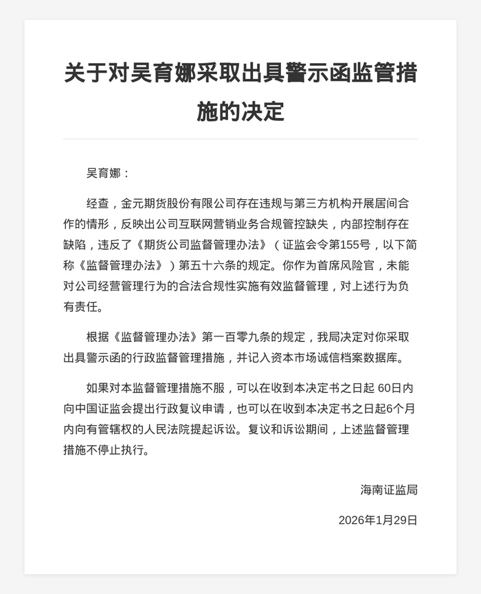 对此,海南证监局决定对金元期货采取责令改正的行政监督管理措施,并记入资本市场诚信档案数据库;对聂义锋、吴育娜采取出具警示函的行政监督管理措施,并记入资本市场诚信档案数据库。