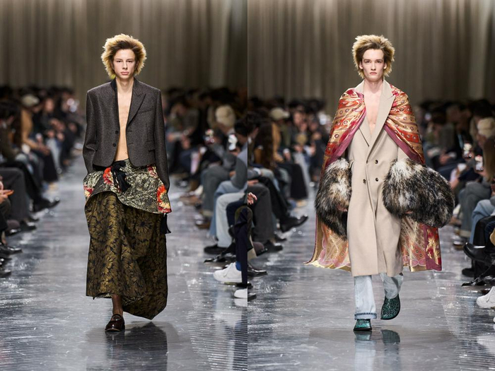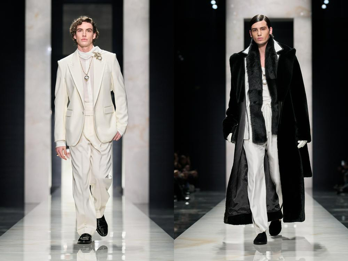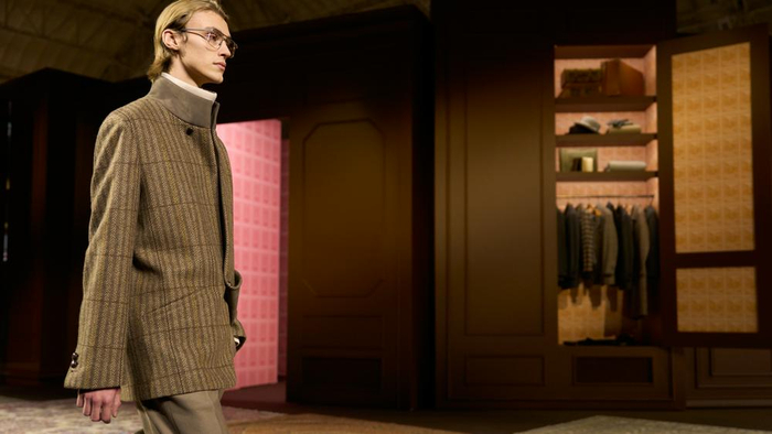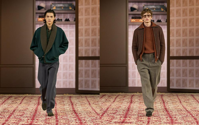 Zegna以“家族衣橱”拉开了本季的序幕,将T台化作一个私密的档案库——一个展现服装如何被保存、传承并逐渐融入个人身份的衣橱。这个想象中的衣橱里陈列着Zegna家族第三代成员Gildo Zegna和Paolo Zegna的真实衣物,也包括来自更早世代的传承之作。衣橱中央的玻璃展柜里珍藏着“ABITO N.1”,这是Zegna在20世纪30年代为Ermenegildo Zegna伯爵打造的第一套西装,为这场时装秀赋予了历史底蕴和传承的意义。