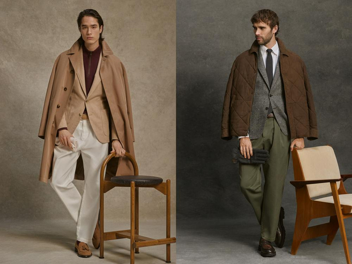 本季依然以西装与外套为轴心,展开对“随性而不失结构”的重新诠释。羊绒与骆马绒外套被赋予更宽松的廓形,风衣也以克制的张力重新定义权威与从容。四袋工装夹克经由羊毛与真丝混纺面料打磨出精致质感,纳帕皮与剪羊毛外套则以几近苛刻的工艺把控比例与细节,彰显品牌一贯的结构美学。