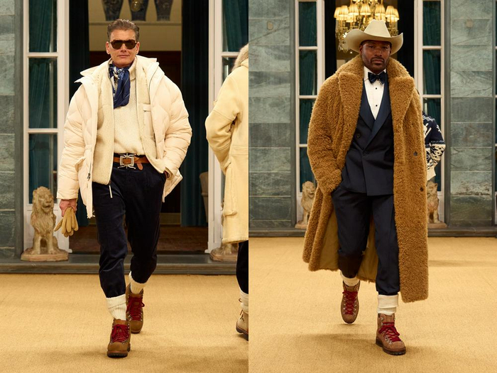 当下的审美趣味在简约的中性色调造型中清晰可见,这些造型既经典永恒,又极具现代感。秉承Ralph Lauren一贯的风格,压轴造型融合了各种元素:优雅的西装搭配做旧皮革外套,燕尾服则与金属色羽绒服相得益彰。最后,曾于90年代与该品牌合作的著名模特Tyson Beckford身着一件奢华的棕色大衣,为这场秀画上了句号。