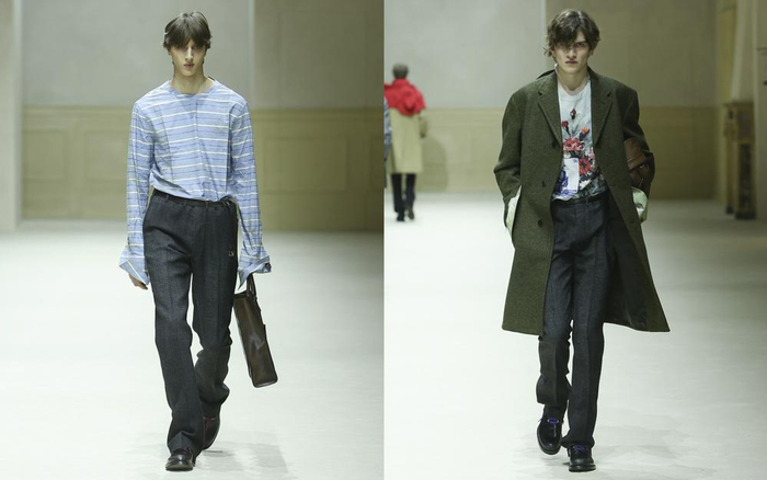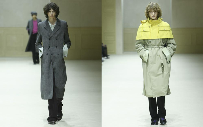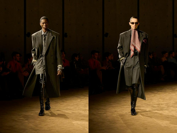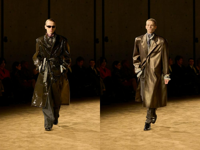 围绕这种“回望中的前行”,Prada 2026秋冬男装系列将目光投向最具代表性的男装原型,并对其进行系统性的拆解与重组。正装衬衫、双排扣西装、雨衣等熟悉元素被重新调整比例与结构:夸大的袖口从修长外套中探出,极窄剪裁的西装强调身体的紧张感,而Mackintosh雨衣则通过色彩叠层与轻微错位,削弱其原有的功能语言。