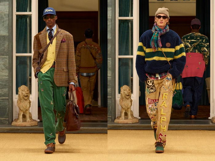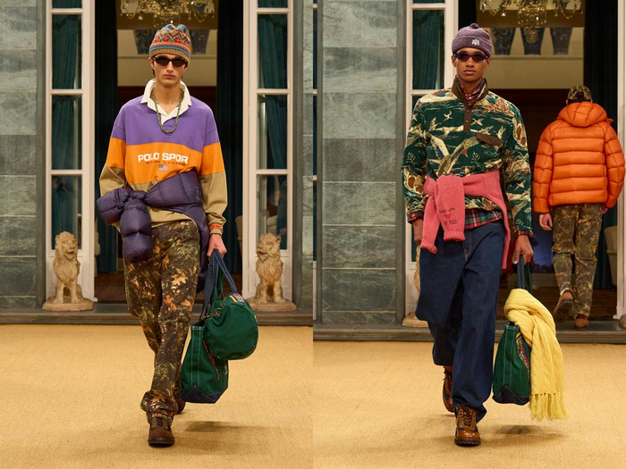 设计师将“不同的男性生活方式”作为线索,学院风、绅士式优雅、传统运动装与复古美式休闲在这一季中被有机交织,形成一幅横跨Ralph Lauren六十余年创作脉络的风格拼图。从带有90年代气息的抓绒、迷彩、Polo Sport橄榄球衫与宽松牛仔出发,过渡至格纹西装、鸭靴与猎装帽构成的学院叠搭,最终落在以棕色、森林绿为主的羊毛与猎装格纹大衣之上,层次递进,勾勒出从青春到成熟的美式男装轮廓。