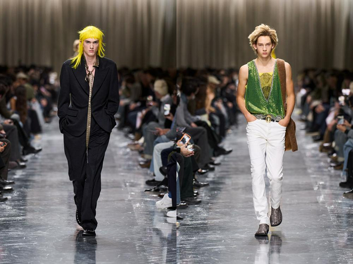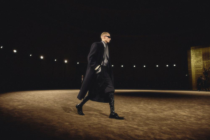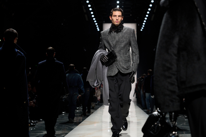 本季的情绪锚点来自詹姆斯·鲍德温于1956年发表的经典小说《乔瓦尼的房间》。Anthony Vaccarello将书中关于欲望与漂泊的主题,转译为一种离开爱人房间、走向清晨的心理状态。由此诞生的衣着轮廓纤细而流畅,在易碎与力量之间保持张力。柔软、略显凌乱的材质暗示着被生活与情感反复触碰的痕迹,而锋利、夸张的肩线则像一道隐形的盔甲,用以抵御社会对男性气质的陈旧定义。