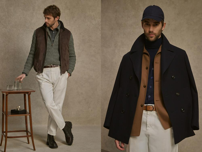 针织贯穿始终,串联了不同面料与场景的语境,轻薄羊绒与精纺美利奴交织出触感与造型之间的张力。配色如调和得当的鸡尾酒,低饱和却充满层次:从奶白、灰蓝、苔绿到酒红、饼干棕,延续了品牌标志性的自然色谱。Canali再次以精妙的方式证明,真正的优雅不是表演,而是一种被反复实践的日常状态。