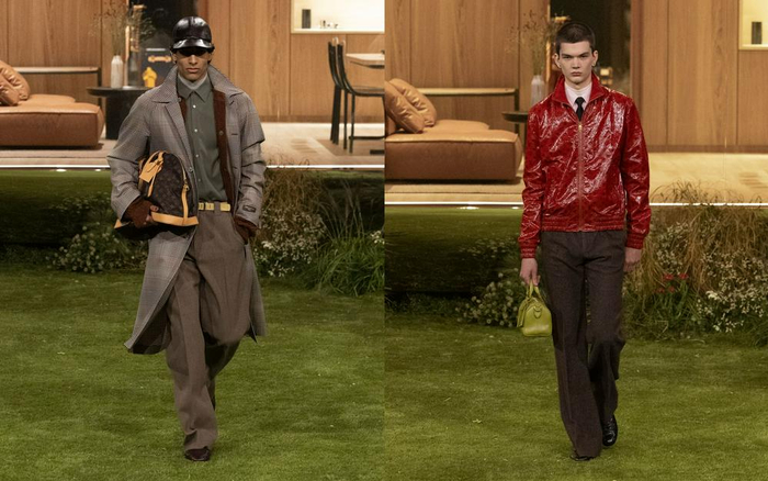轮廓语言延续了Pharrell所设想的“未来绅士”形象:上世纪80年代柔和剪裁与当代松弛体积并置共存。可双面穿着的派克大衣、假高领内搭与偏运动感的西装,传递安静而前瞻的气质。水滴作为反复出现的意象,被转化为水晶装饰,分布于粗花呢外套、牛仔裤,乃至镶嵌11,000颗水晶的Keepall包袋之上,象征微小之变所引发的层层涟漪。这一季并未试图用戏剧性瞬间夺目,而是以精准克制的表达,持续探索男装美学中“恒久”与“进化”的辩证关系。