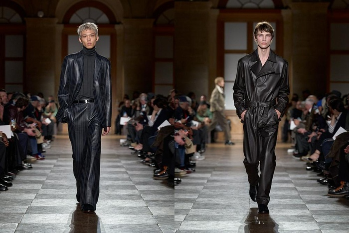 最动人之处,或许在于Véronique Nichanian将品牌档案中的旧作与全新设计巧妙融合于同一语境中。一套2003年的皮革西装、以及上世纪90年代初的牛皮连体服自然地融入整场叙事之中,映射出她一以贯之的理念:伟大的服装是陪伴岁月的伴侣,而非昙花一现的季节产物。Véronique Nichanian的最后一场秀并非试图翻篇,而是将她数十年来的坚持悄然写下句点——她从未偏离那个她始终深知的爱马仕男士形象。