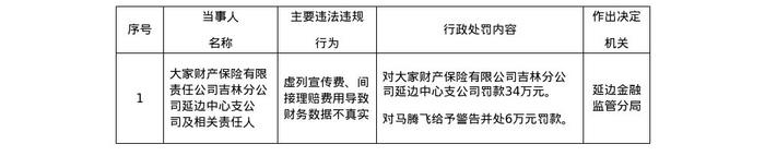 罚单显示,大家财产保险有限责任公司吉林分公司延边中心支公司的主要违法违规行为是:虚列宣传费、间接理赔费用导致财务数据不真实。