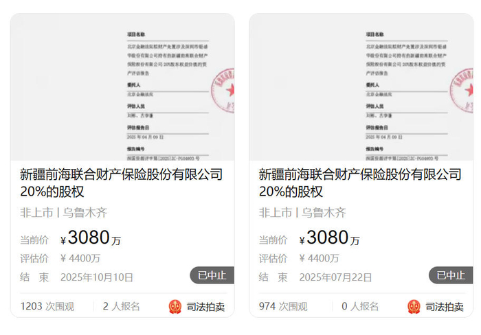 伴随着钜盛华陷入债务危机,前海财险亦受到牵连,其股权遭法院冻结被拍卖。2025年6月,前海财险公告称,钜盛华所持有20%的股权(出资额为20000万元)将被拍卖,评估价4400万元,起拍价3080万元,起拍时间为2025年7月21日。