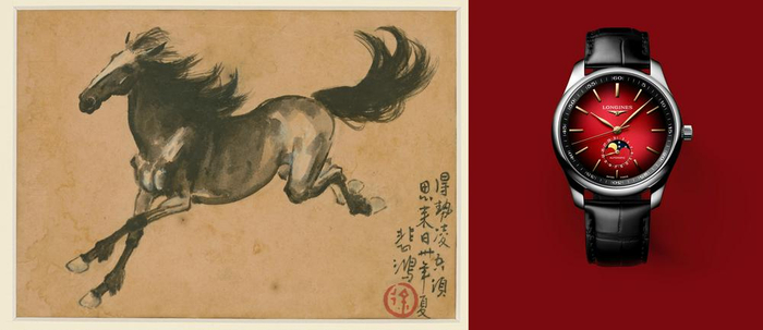 浪琴表邀请徐悲鸿美术馆合作,推出名匠系列马年生肖限量款腕表,将瑞士精纯制表传统与中国传统生肖文化相结合。浪琴表选取中国画家徐悲鸿的经典作品《奔马(得势)》作为设计灵感,将画作中的奔马形象镌刻于机芯摆陀之上,该腕表全球限量发行2026枚。