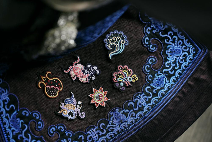 品牌甄选六款马尾绣传统纹样进行再设计,包括太阳纹、蝴蝶纹、石榴纹、流云纹、鱼纹与凤纹,并分别对应不同寓意主题。这些图案取材于自然与民俗象征,在线条结构与针法细节中保留马尾绣特有的质感与节奏。
